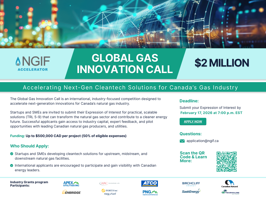 CALGARY, AB (December 17): The NGIF Accelerator is proud to launch the Global Gas Innovation Call, an international, industry-driven competition accelerating next-generation cleantech innovations for Canada’s natural gas sector. This competition provides startups and SMEs with pathways to validate, scale, and reduce commercialization risk across the Canadian natural gas value chain.